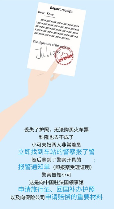 无论护照是被抢还是被盗,你都需要向警方报警,取得报案通知单复印件,这是你向中国驻当地领事馆申请临时旅行证、回国后补办护照以及向保险公司申请赔偿的重要材料,切记!